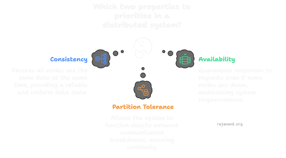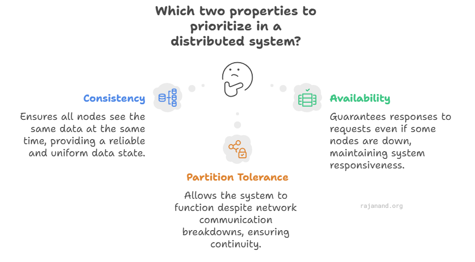 - You cannot have all three properties (Consistency, Availability, Partition Tolerance) simultaneously in a distributed system.